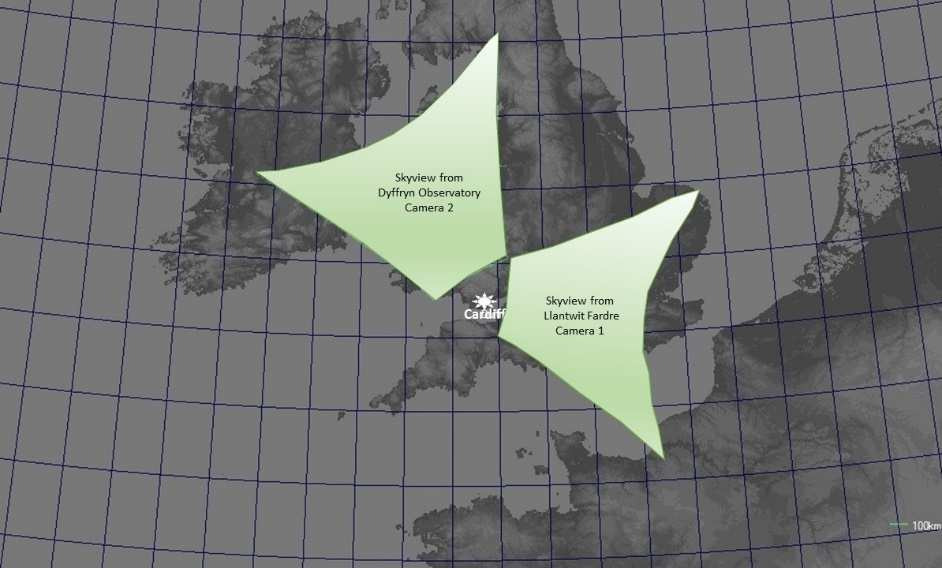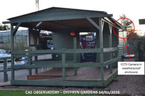 CAS Camera 1 is located at Llantwit Fardre under the supervision of Martin Chick, the axis of the field of view is to the East. I look after CAS Camera 2 which is located at the CAS Observatory in Dyffryn Gardens, the axis of the field of view is to the North West.