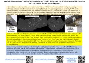 Cardiff Astronomical Society (CAS) have been recording meteor, sprite and fireball events since joining the United Kingdom Meteor Observation Network (UKMON) in November 2013.